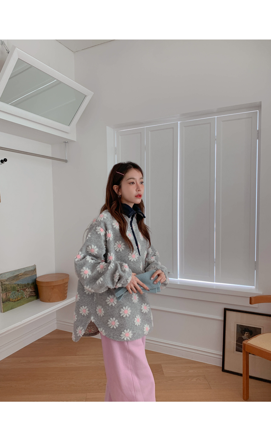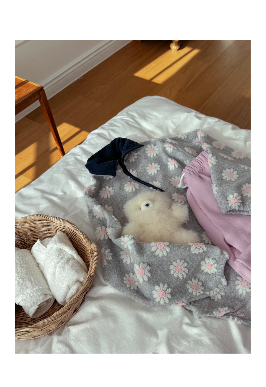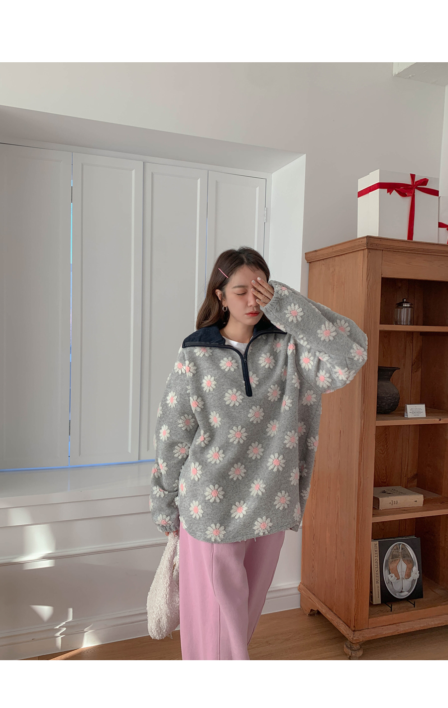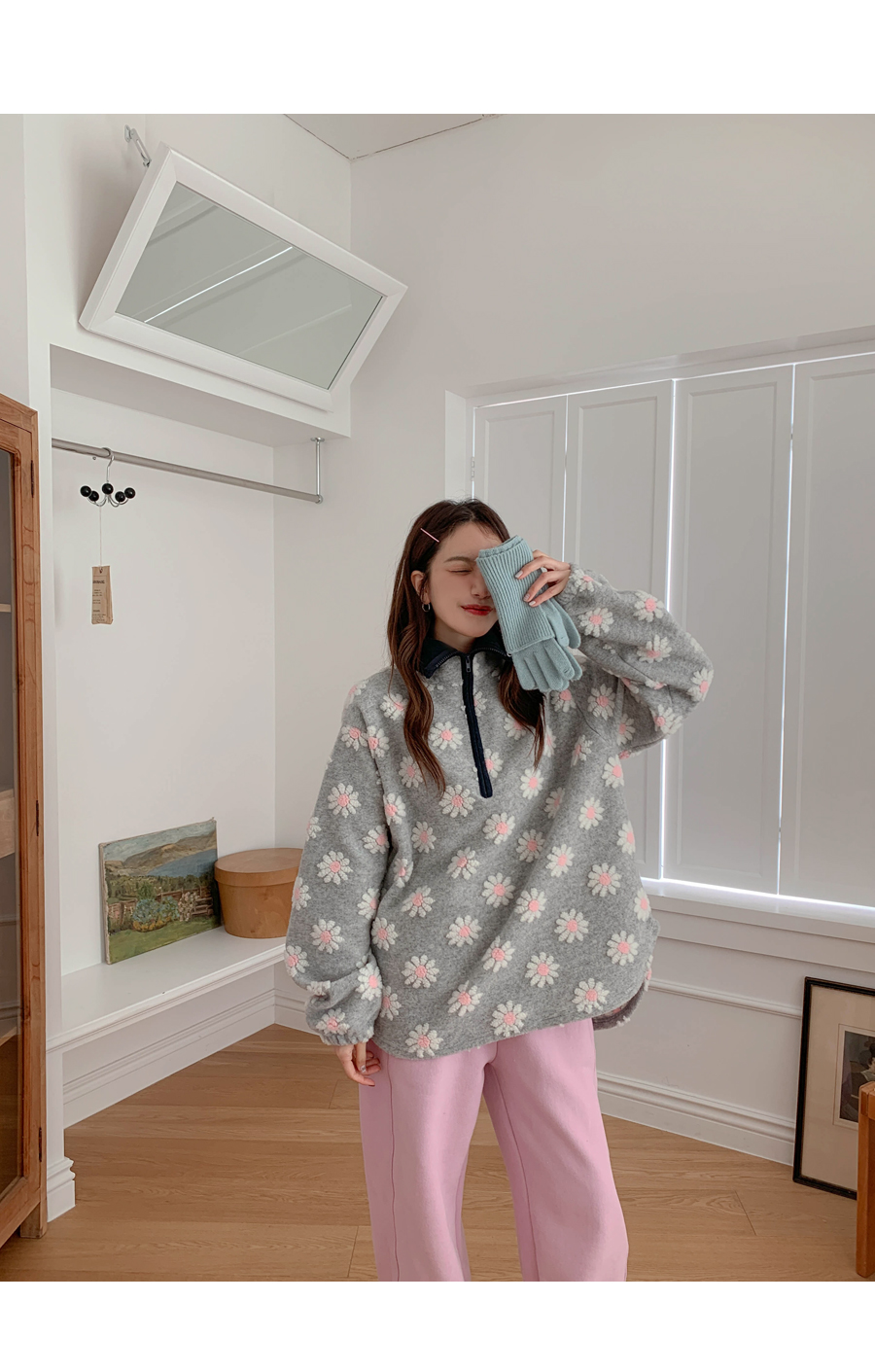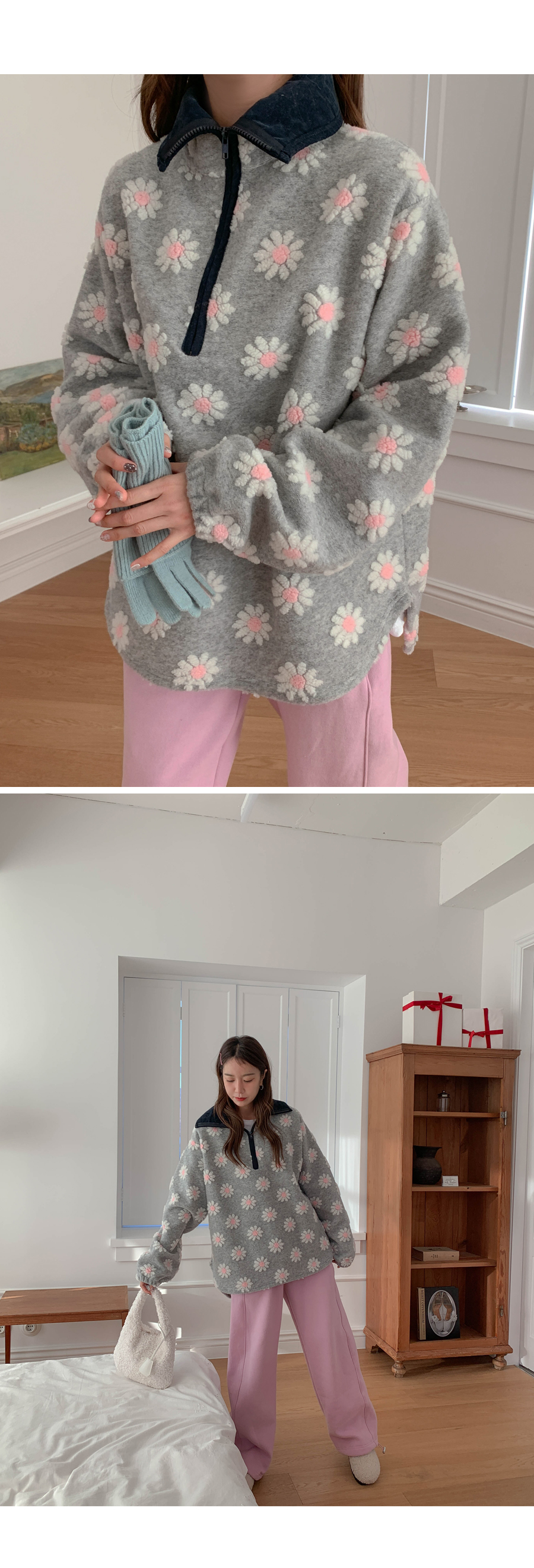 Flower color combination tumble fleece half-zip up uneven anorak